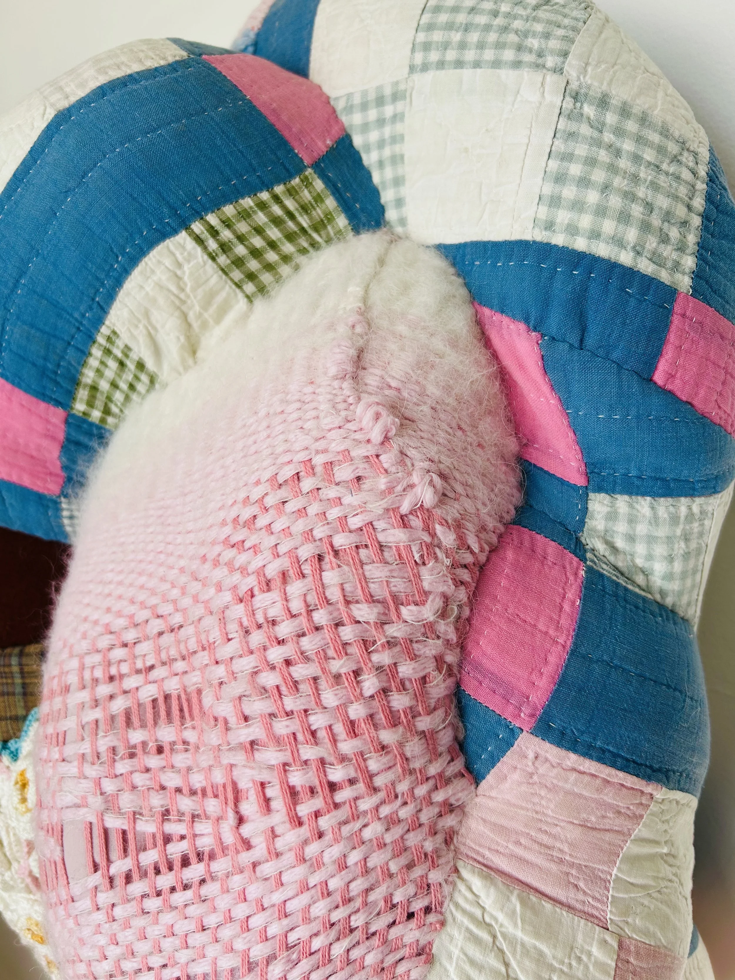 Interstice, reclaimed textiles, tennis balls, wool, cotton thread,& polyfil, 21” x 10” x 30”, 2025